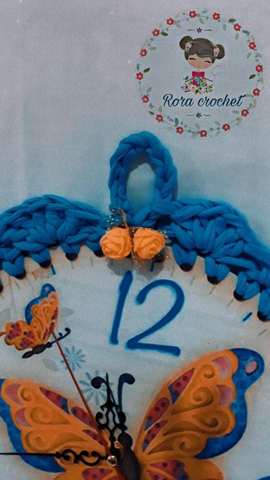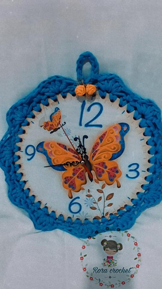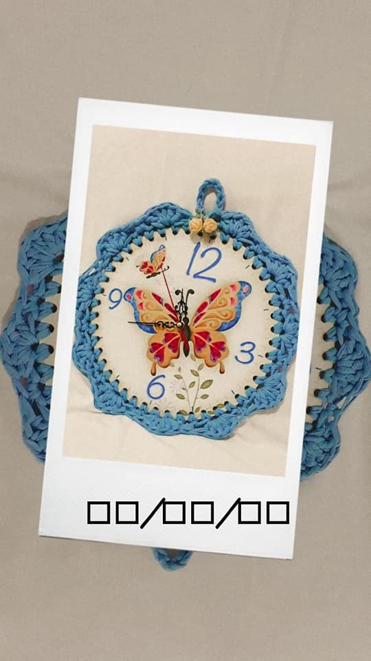ساعة حائط باللون اللبنى السماوى بتصميم رقيق وفراشة فى المنتصف باللون الاصفر عملية وشيك ويمكن تنفيذها بالوان ومقاسات مختلفة